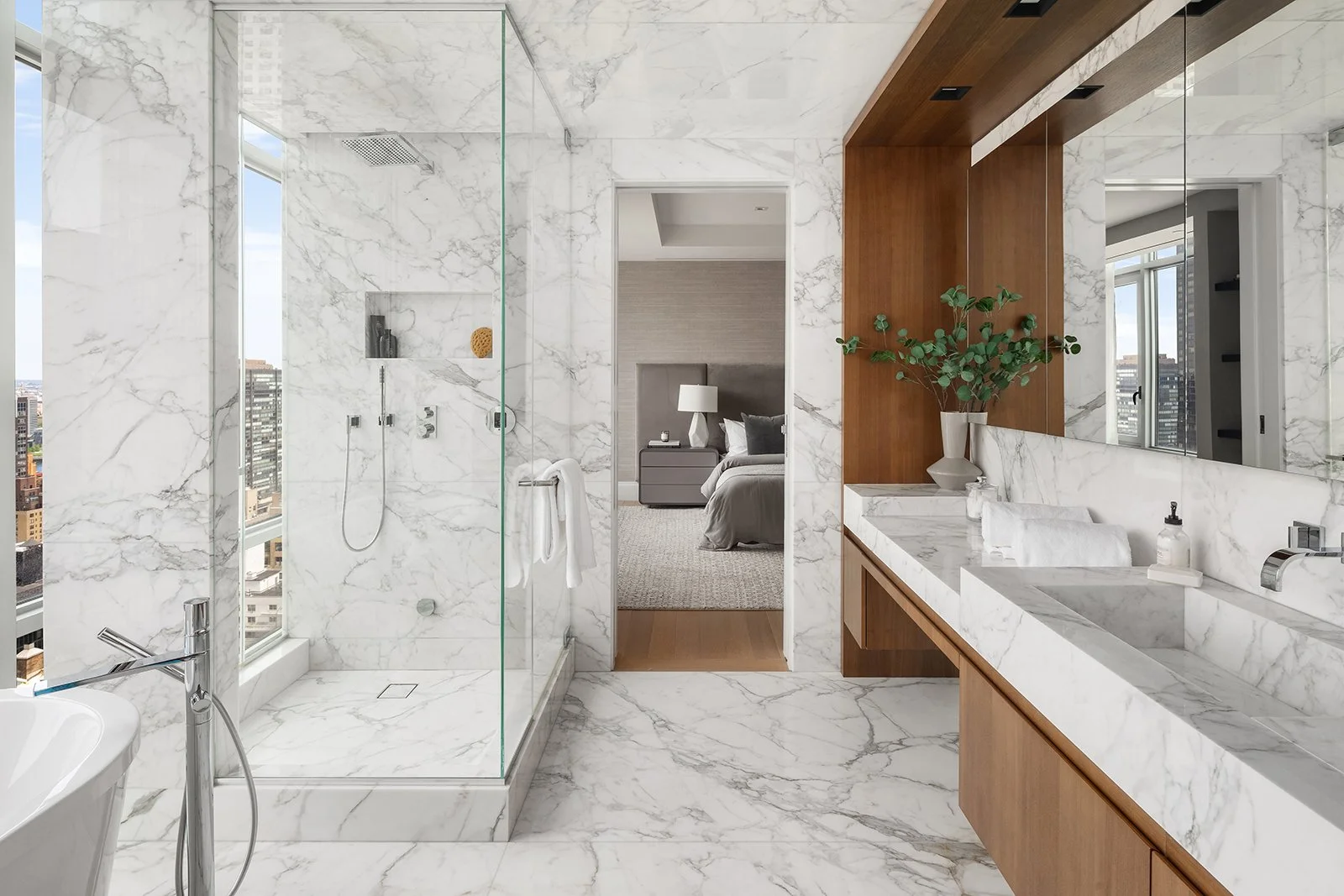 The primary suite possesses a 10-ft deep walk-in closet with built-in storage and a spa-like en-suite bathroom with radiant heated statuary Bianco Oro marble floors, an enclosed toilet, a floating double vanity, a steam rain shower, and a freestanding soaking tub.